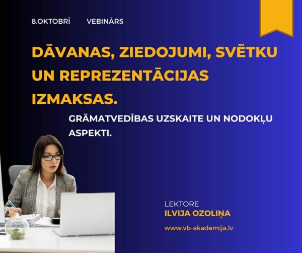 Semināra lektore: Mg. oec. ILVIJA OZOLIŅA, Nodokļu konsultante, sertificēta praktizējoša grāmatvede ar divdesmit gadu pieredzi, grāmatvedības kursu pasniedzēja, nodokļu semināru lektore. Ieguvusi sociālo zinātņu maģistra grādu ekonomikā. Strādājusi Valsts ieņēmumu dienestā (VID), kur nodokļu maksātājiem veikusi auditus, tematiskās pārbaudes, sniegusi konsultācijas. Jau astoņus gadus vada grāmatvedības ārpakalpojumu uzņēmumu ar klientu loku no dažādām nozarēm. Grāmatvedības kursu pasniedzēja